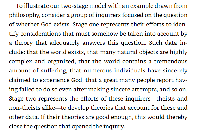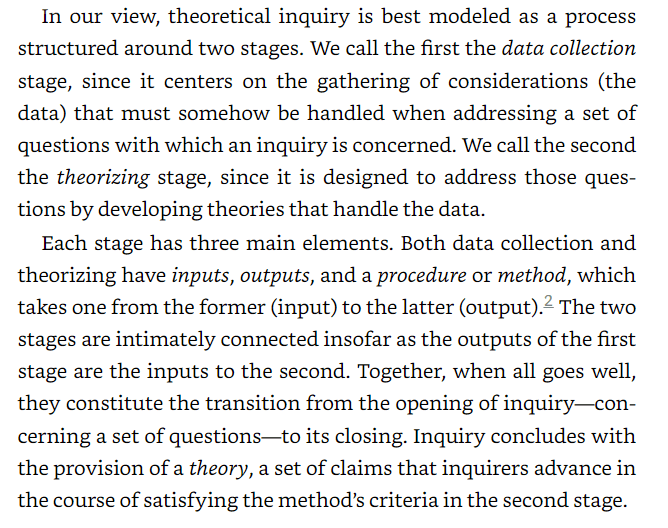 John Bengson, Terence Cuneo i Russ Shafer-Landau, en el llibre Philosophical Methodology (Oxford, 2022) (*tinc pendent de llegir amb profunditat*) proposen d’entendre el que anomenen “theoretical inquiry” com un procés estructurat en dues etapes.