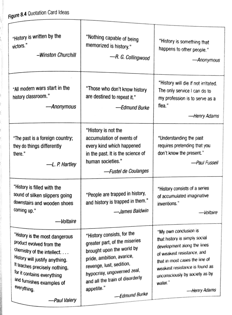 - El llibre Academic conversations de Jeff Zwiers i Marie Crawford conté una activitat molt semblant, “My Image of and in History” (p. 158), adaptada al seu torn de Drake and Nelson, 2005, Engagement in Teaching History: Theory and Practices for Middle and Secondary Teachers. Columbus, OH: Person. No estic segur si l’activitat que proposo aquí no és una metamorfosi silenciosa que ha anat fent en el meu cap aquesta activitat proposada per Zwiers i Crawford, i que havia oblidat completament ↩︎