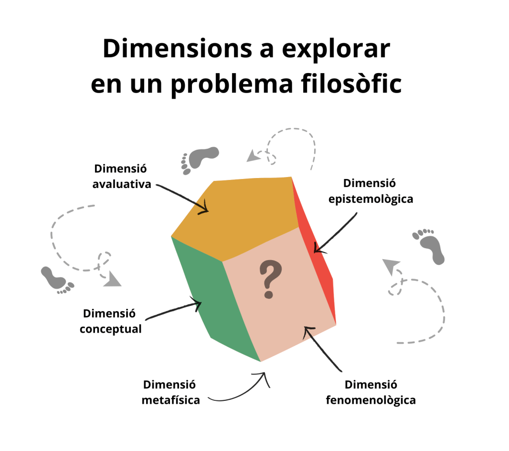 Naturalment, no pretenc dir que, quan fem filosofia a l’aula, haguem d’explorar exhaustivament totes les dimensions d’un problema. Un problema filosòfic no es resol3 per addició d’idees. Tampoc no és un procés linial: un videojoc amb cinc pantalles. És un procés que va i ve (les fletxes saltarines i les petjades de la imatge pretenen suggerir això).