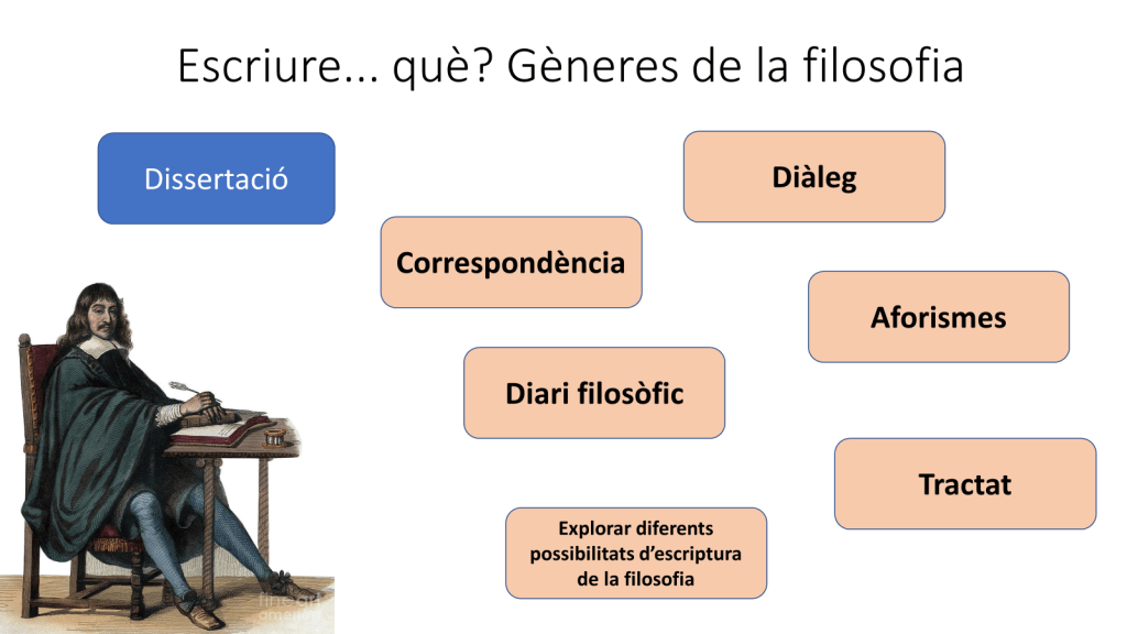 Sense deixar de practicar la dissertació, no podríem tanmateix ampliar el ventall de registres i fer de l’escriptura una ocasió d’experimentar formes diferents de fer filosofia, més “personalitzables” i adaptables a diferents escenaris i propòsits?