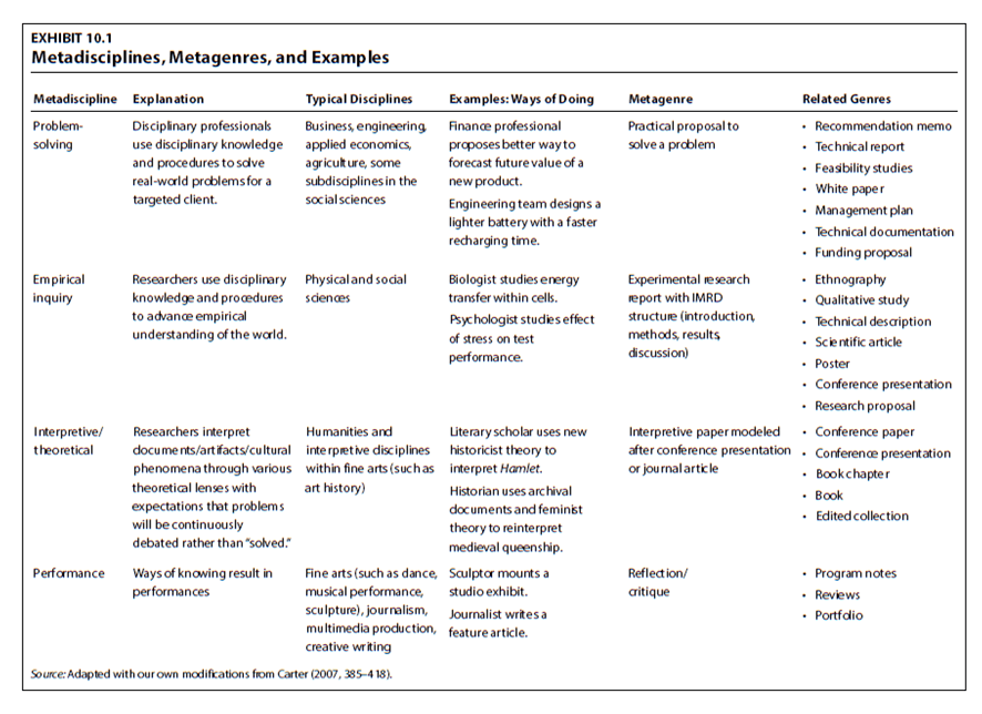 Sempre m’ha fascinat aquest gran mapa que John C. Bean i Dan Melzer (2021) proposen per entendre el món del coneixement. Agrupen les disciplines en grans tipologies que anomenen meta-disciplines i els gèneres en grans tipologies que anomenen meta-gèneres. Per a les disciplines amb identitats borroses com la filosofia, és divertit preguntar-se on som. I crec que l’interès de la idea de l’informe filosòfic rau justament en el fet de convidar-nos a veure què passa si mirem la filosofia sota un prisma (una meta-disciplina) diferent i, enlloc de veure-la com una disciplina interpretativa condemnada a l’errància1 (és potser la disciplina més errabunda de totes?), la veiem d’una manera més pràgmàtica, com una forma especial de problem-solving (Mary Midgley comparava la filosofia amb una forma de fontaneria que s’ocuparia d’arreglar problemes en els nostres complexos sistemes conceptuals!)