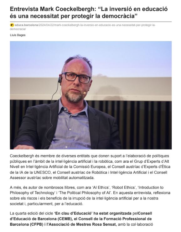 Pista per a docents: localitzar entrevistes és molt fàcil. Busqueu a un cercador nom de la persona que us interessa + entrevista i veureu com descobriu un gran ventall d’opcions. És molt habitual que els grans diaris publiquin entrevistes amb filòsofes i centífiques que acaben de presentar un llibre o una recerca important. La premsa actua així, en part, com una mena de gran aparador i a la vegada traductor de la ciència i el pensament, fent-los més propers al gran públic (tot i que, naturalment, no està lliure de perills i defectes: biaixos, manipulació, interessos, silenciament, sobredimensionament, etc.). Si us fixeu en la manera com vosaltres mateixos entreu en contacte amb noves idees o amb veus d’experts que us interessen, segurament us adonareu de l’important paper que hi juga.