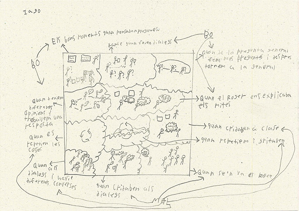 Oriol: Jo el que crec és que les preguntes filosòfiques s’han de tractar amb més gent. O sigui, amb un diàleg filosòfic. I a més a més has d’estar molt concentrat per aquella pregunta, has de treure fum pel cap. Però jo el que penso és que […] ha d’haver-hi més gent.