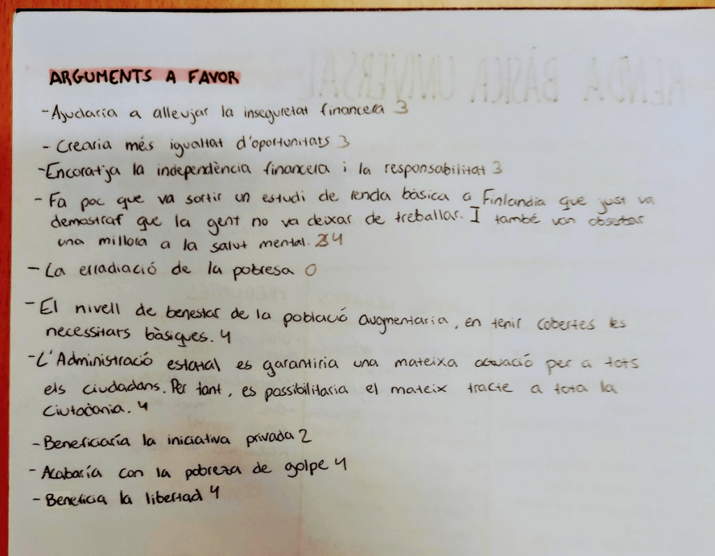 Estàvem llegint articles en parelles sobre la renda bàsica amb l’objectiu de recollir idees per a una controvèrsia constructiva i unes alumnes asseguraven que “ja havien acabat”. Feia estona que les veia distretes i enriolades. Però jo sospitava que darrere del “ja hem acabat” no hi havia necessàriament una comprensió en profunditat de l’assumpte. Necessitàvem alguna forma d’avaluació express, algun petit gest que les impulsés a mirar-se de nou les idees, més fit a fit.